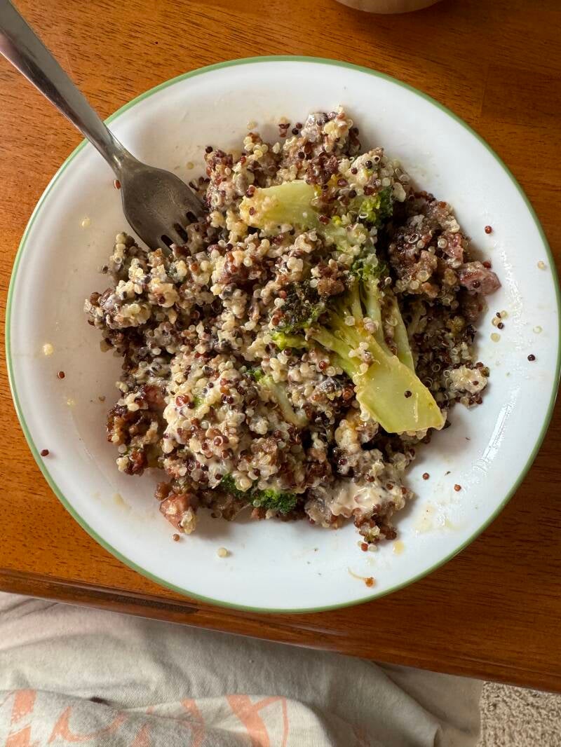 -when the quinoa is done cooking, add in your broccoli and your meat and stir together and then cover generously with zesty ranch! So delicious 🤤